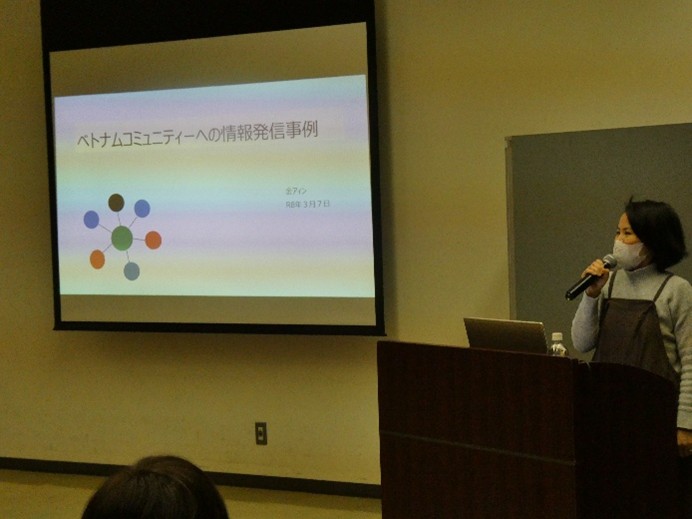 前半は、ベトナム出身の金(こん) アインさんによる事例報告です。自身のSNSで配信している内容を画面に表示しながら説明しました。後半は、交流会を実施し、事例報告の感想の後、地域での活動事例(自治会、学校のPTA活動)などについて話してもらいました。また、TIAのホームページで公開している日本の文化やルールについてのリーフレットを参考にし、意見などを話してもらいました。