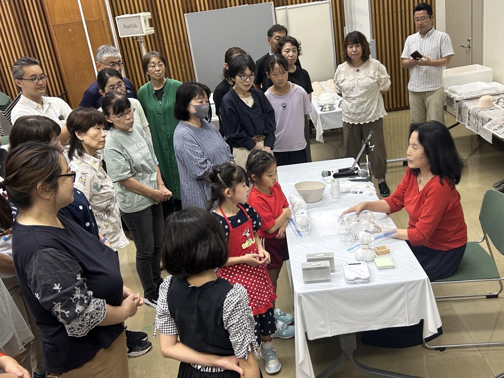 最初にメイン講師の林さんが、同プロジェクトがこれまで実施してきた数々の活動及び参加者が作製した作品(お皿)をスライドで紹介し、出来上がりのイメージが膨らんだところで、作り方の実演です。林さんの周りに参加者が集まり、熱心に手順を覚えます。