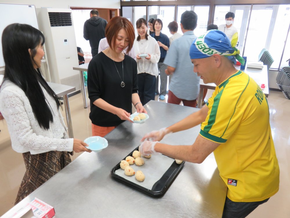 アマゾンの紹介に続き、場所を変えて「ポンデケージョ」の試食です。サチオさんが焼きたてのチーズパンを配ります。参加者は、皮はパリパリ中はもちもちの本場の「ポンデケージョ」を味わいながら、サチオさんが実演したブラジル産の楽器を実際に触ってみたりしました。