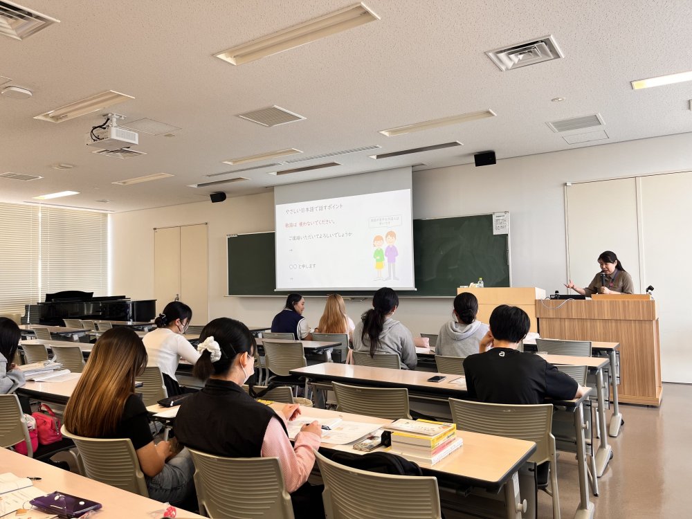 多文化共生の保育の実現に向けて、異なる文化・言語的背景を持つ人々を理解することを目的とした選択科目の受講学生や聴講生を対象に、栃木県の外国人の状況や多文化共生、外国人とのコミュニケーションに役立つ「やさしい日本語」についてTIA職員が紹介しました。実践演習としては、園からの通知文を外国人保護者に説明するペアワークを行いました。