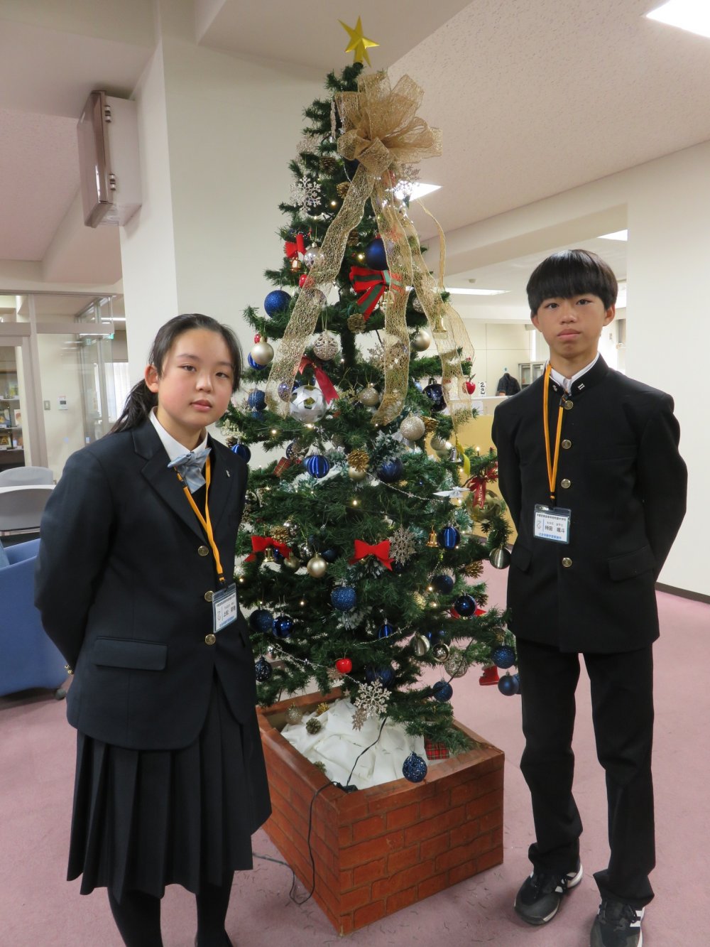 ▲交流ラウンジにクリスマスツリーを飾った二人