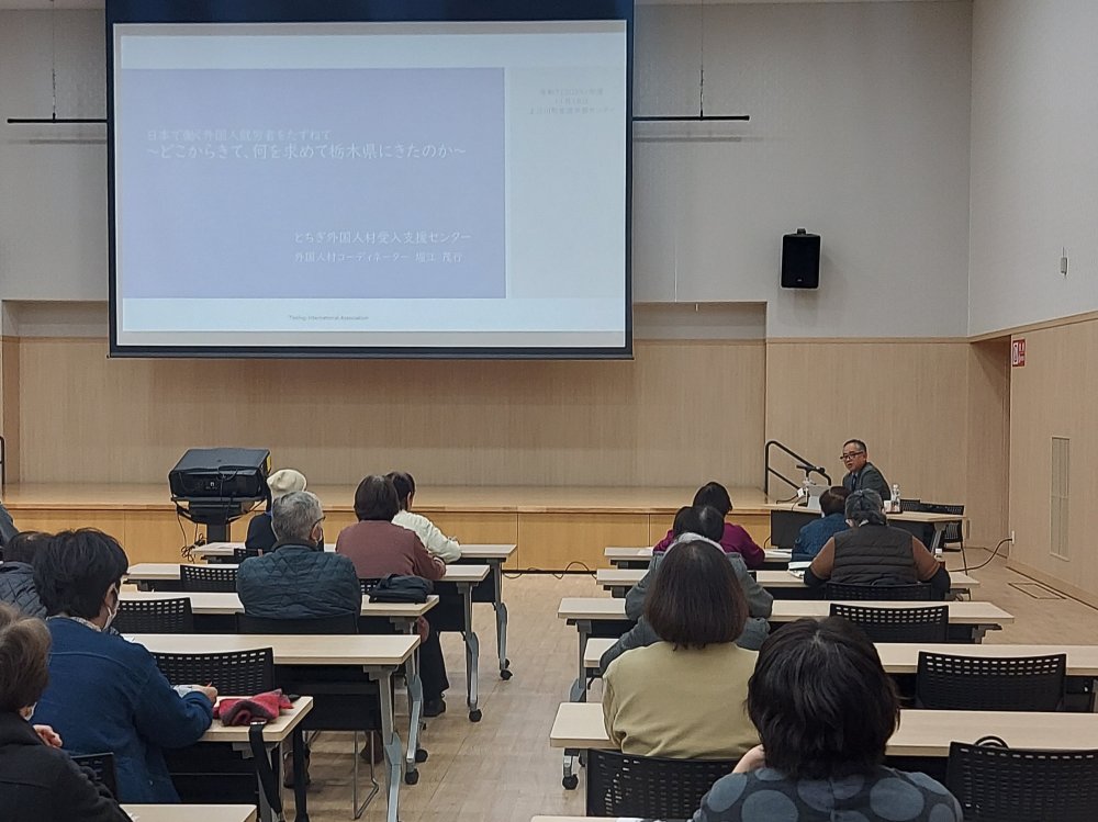 上三川町の町民を対象に おとなの学び直し講座として開催されている「オリプラカレッジ」において、とちぎ外国人材受入支援センター・外国人材コーディネーターの堀江が 参加者45名を迎え講話いたしました。