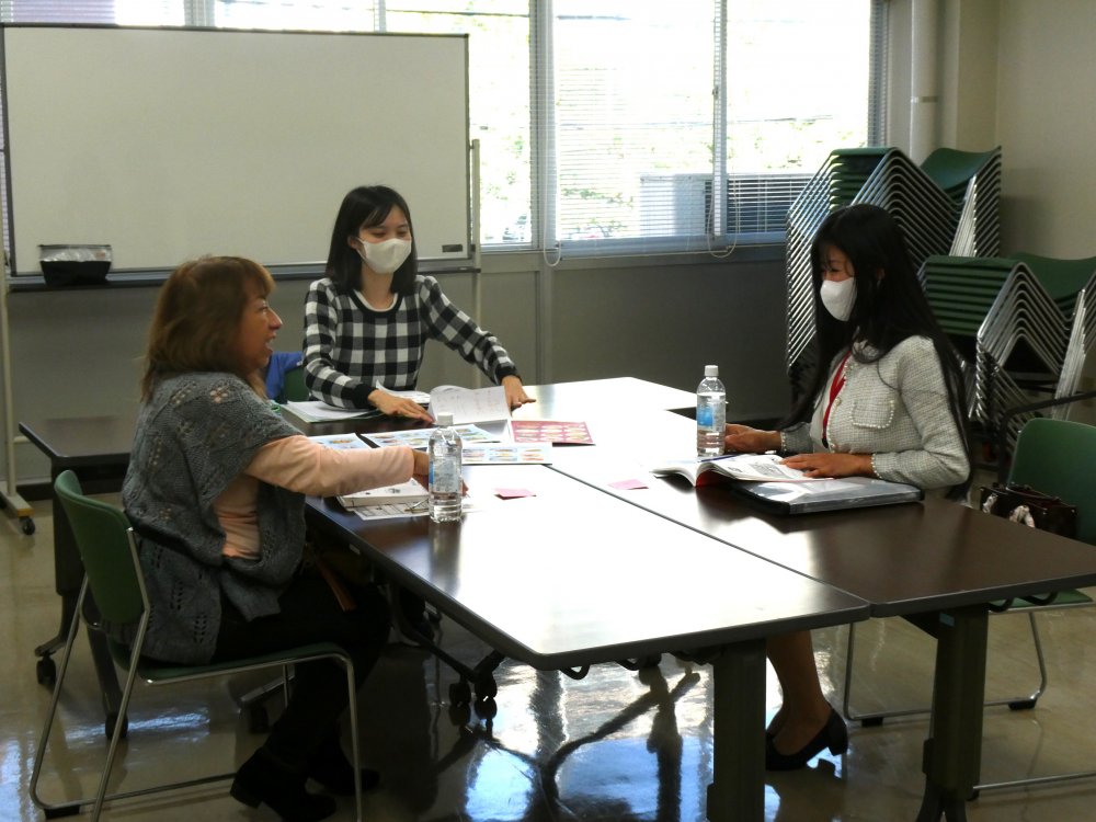 外国人協力者に対して日本語学習支援の体験を行う参加者(中央)