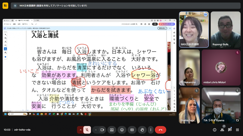 第2回~第11回はオンライン授業です。参加者は、10時から11時までの1時間、「介護現場でのコミュニケーション」「認知症」「薬の種類と形状」「身体介助とお声がけ」など、介護現場で実際に使われる日本語を学びました。