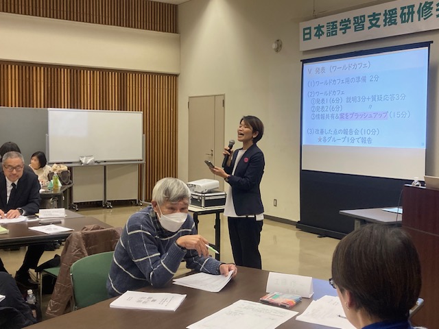 研修会前半は、学習者のニーズを深堀する視点、ニーズ分析、学習支援の目標や学習項目の立て方について考えました。また、日本語教育の参照枠に基づく「生活can do一覧」の利用方法や教室でできる小さなワークも紹介されました。