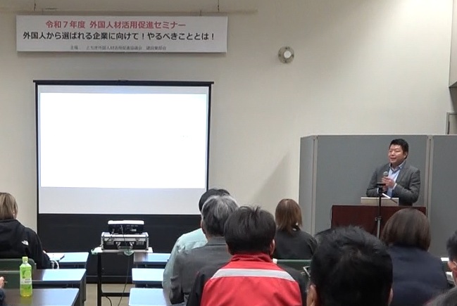 建設業において、外国人材の受入れが進む中、長年続いた技能実習制度が、「育成」と「確保」を重視した外国人材雇用のための育成就労制度に代わります。その一方で、日本人従業員との間に業務負担や人間関係の摩擦が生じ「定着」につながらないケースがあり、これらを解決につなげるセミナーとして、県内建設業の経営者及び現場指導者を対象に、外国人雇用のための制度と留意点、また、外国人と日本人、それぞれがやりがいをもって活躍できる現場に必要な環境整備について、株式会社ワールディング 執行役員 池邊 正一朗 氏に解説いただきました。