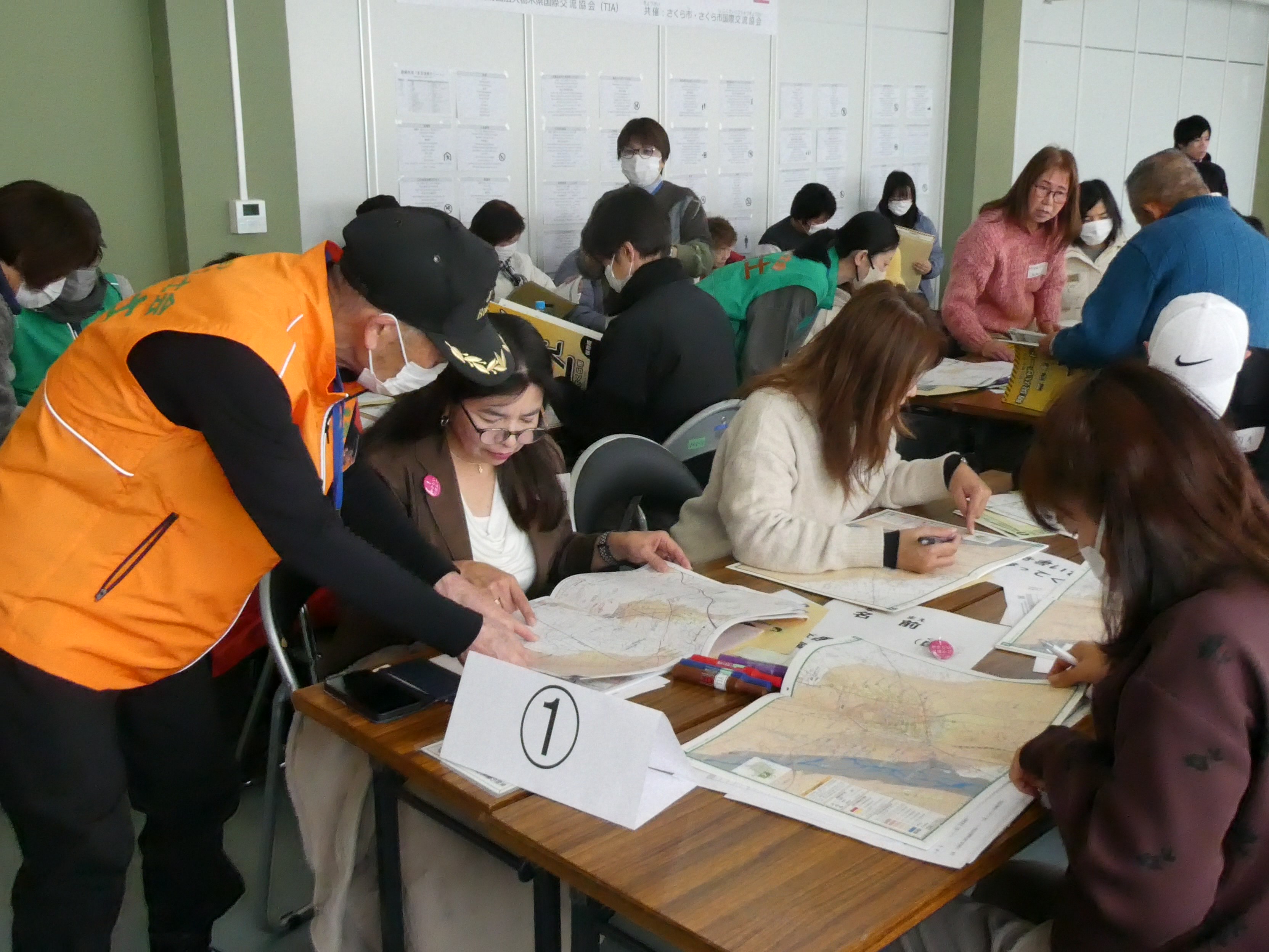 前半は講義形式で、さくら市国際交流協会高瀬会長からさくら市の防災についての講話の後、TIA 職員が日本の災害や避難所について「やさしい日本語」で説明し、TIA 外国人キーパーソンのさくら市在住のグエン・フン・タンさん(ベトナム出身)が、自ら体験した地震や台風などの経験から、参加者たちに日ごろからの防災準備についてのアドバイスをしました。その後、防災士が手伝いながら、ハザードマップを使って参加者が各自、自宅近くの避難所探しも行いました。