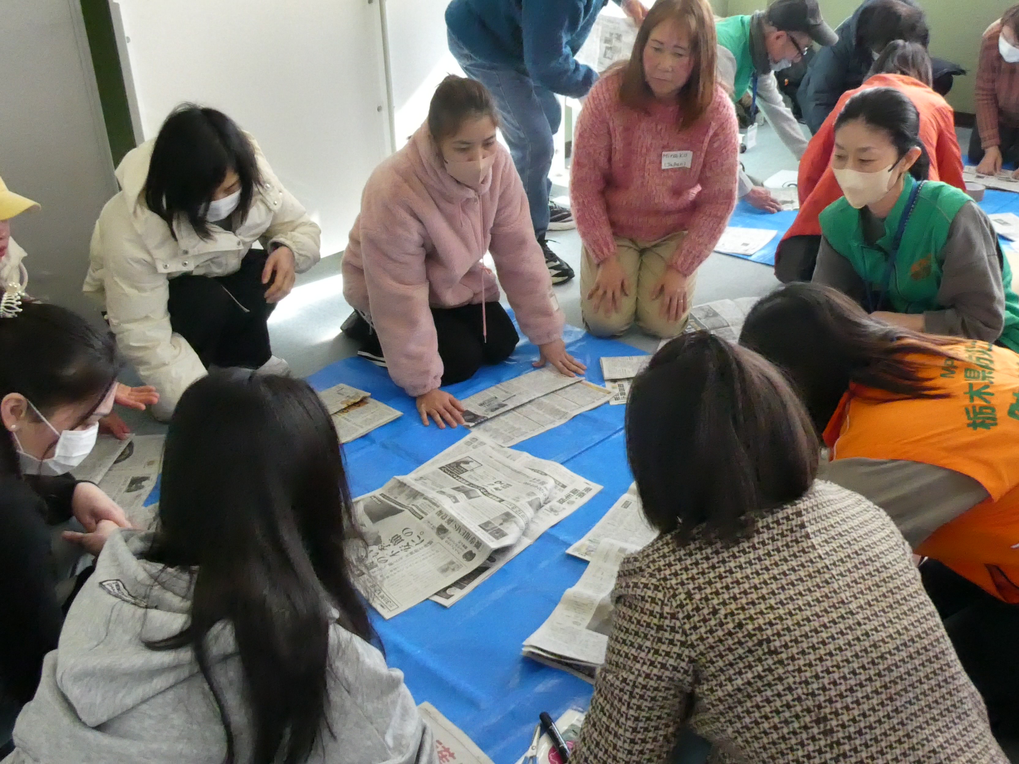 後半は栃木県防災士会理事が非常持ち出し袋の説明をした後、各グループに分かれて、ブルーシートの上で、防災士に教わりながら、新聞紙のスリッパやポリ袋で作れる防寒服を作りました。また段ボールを利用した簡易トイレも作成し、実際に座って使用法の体験もしました。